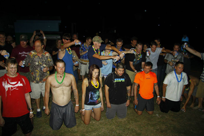 HIM--HIM, F*** HIM (rhymes with duck) and the POURING begins. About the time, the candidate thinks all the beer is poured over them, the moderator will ask, "IS IT OVER?!?!?!?" And the crowd says, NO!!!!!!! And the dunking begins again (this can go on for four or five waves).